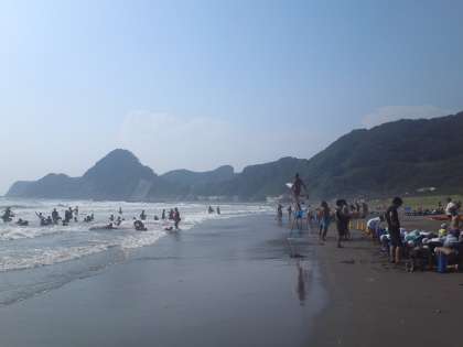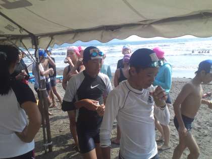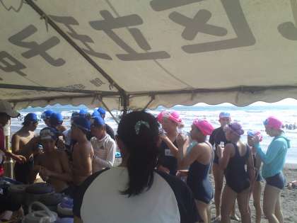 ライフセービング、グループごとに、いろいろなことにチャレンジですね。風がありやや波が高いですが、頑張っています。