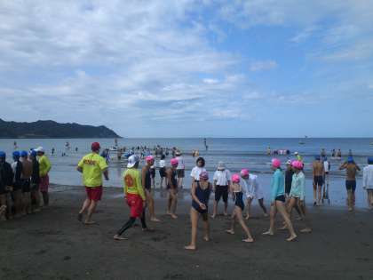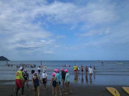 ライフセービング、多様なメニューに次々にチャレンジですね。生徒の皆さん、海風とともに、沖に泳ぎ出します!