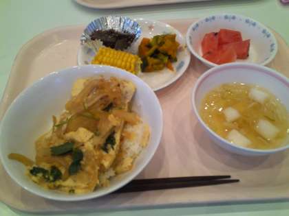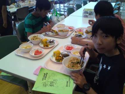 昼食です。カツ丼、スイカなど皆さん、元気に食べています。