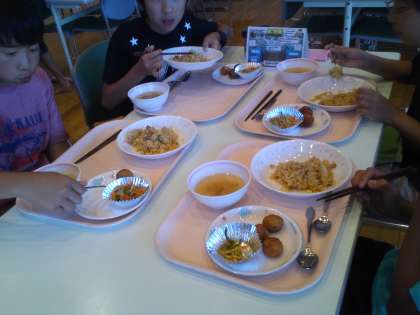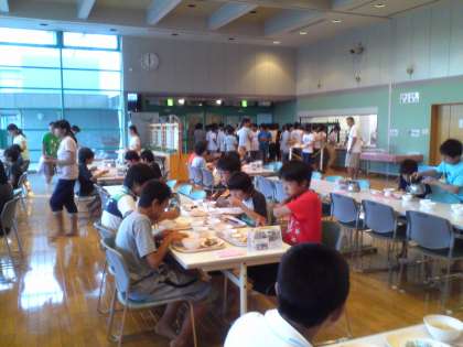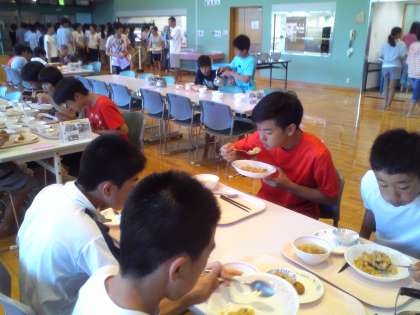夕食です。昼飯も夕食も、おかわりのご飯を食べつくしました。女子生徒のおかわりがなくなり困りました。おかわりのご飯がなくなることは、他の中学校ではないそうで、1年生徒のパワフルさを感じるところです。早速、栄養士さんに申し入れましたが、明日の朝食はパンです。昼飯は、マザー牧場でジンギスカンで、食べつくすのでしょうか。