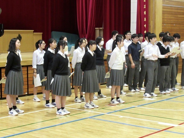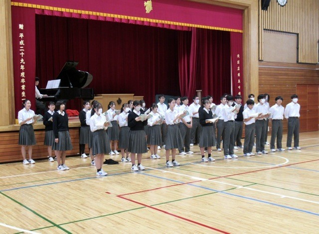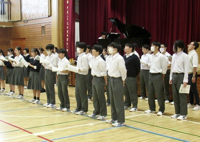 終業式での 「 校歌斉唱 」 をしっかり歌おう!と、3年生がウォーミングアップのかけ声を、また、指揮者からもメッセージが伝えられ、 「 東に 希望の 空かがや~き 」 と 。