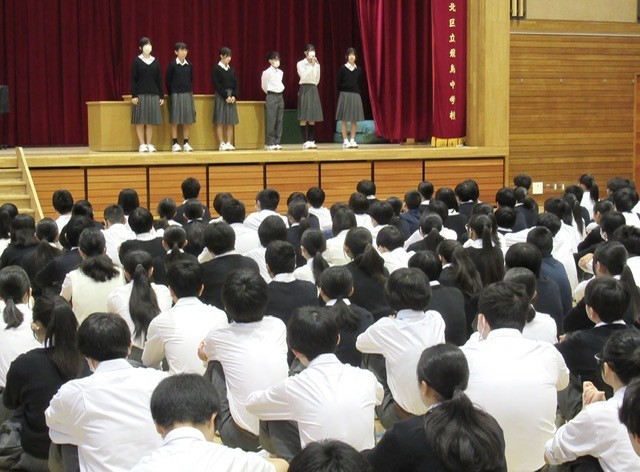 その後、生徒会担当の先生から、各新委員会の活動の始まりにあたり、委員長が2年生になったこと、そして、全校生徒の力で生徒会活動を充実させてほしいと。