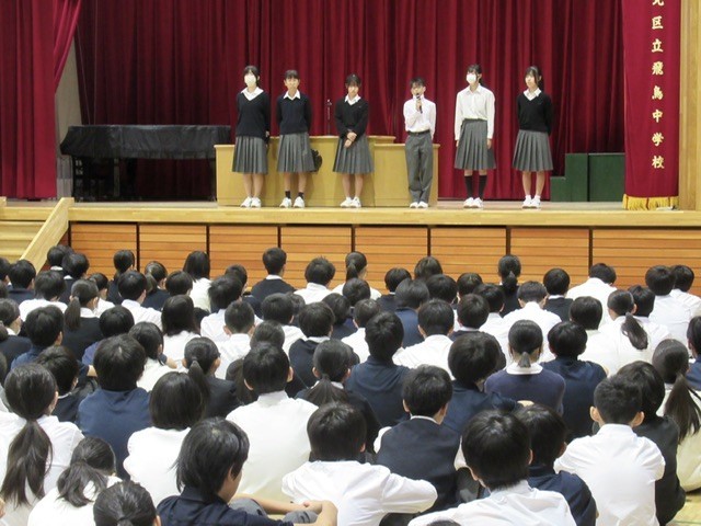その後、新生徒会役員から一言ずつあいさつがありましたが、あいさつの中に、それぞれが思う 「 飛鳥中が1番の学校 」 について伝えてくれました。