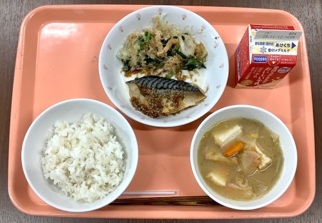 学校生活 <今日の献立> ご飯 ・ 鯖の香味焼き ・ 油揚げ入りおひたし 味噌けんちん汁 ・ 牛乳