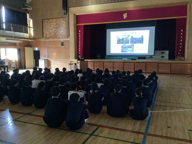 最初に体育館で講義を受けました。過去の災害を教訓とした、 「 自助 ・ 共助 」 についてのお話がありました。