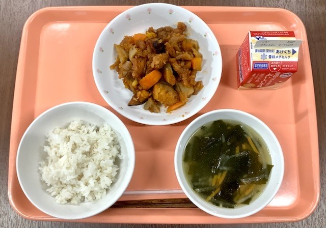 ご飯 ・ 根菜の甘酢あん ・ わかめスープ ・ 牛乳