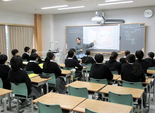 派遣団を引率していた英語科の教員は、授業の冒頭、 SHS ( セブンヒルズスクール ) での様子を報告していました ( もちろん英語で ) 。
