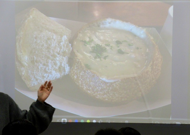 サンフランシスコでの初日に食べた食事の印象 ( 写真 : 2枚目 ) 。 サンフランシスコの名物の一つである  「 クラムチャウダーボウル ( クラムチャウダーがパンの器に入ったもの ) 」 が、とても酸っぱく食べきれなかった、と。