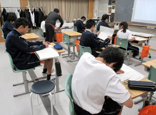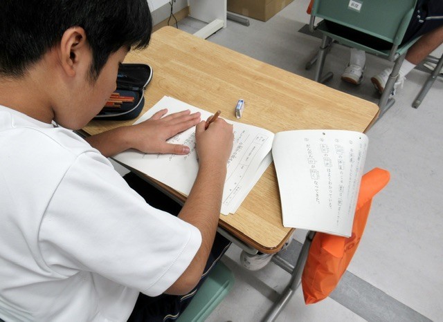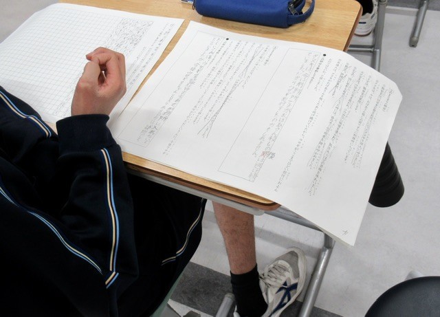 生徒たちは、話の内容が変わらないように、短くまとめて文章にしようと一生懸命 考えています。
