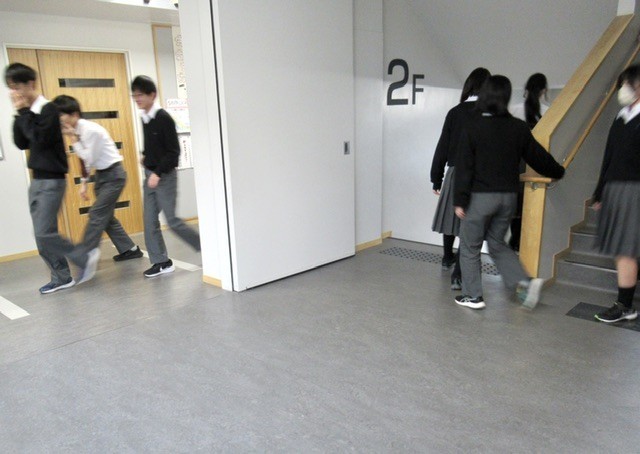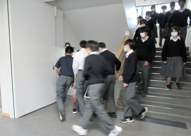 生徒たちは、中央階段と体育館側の階段を使用し、速やかに避難します。