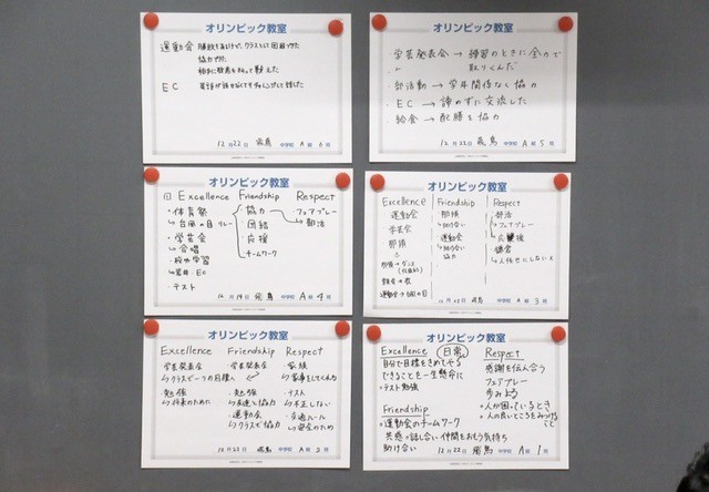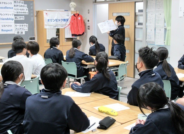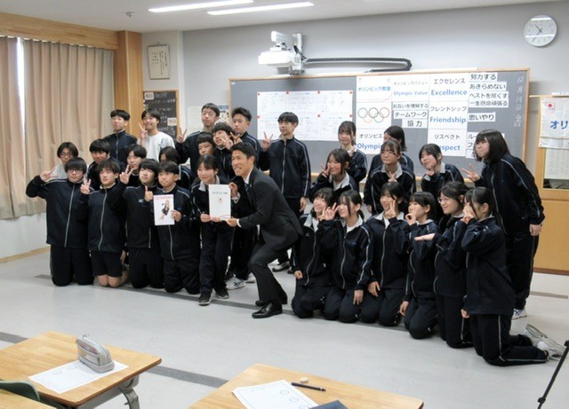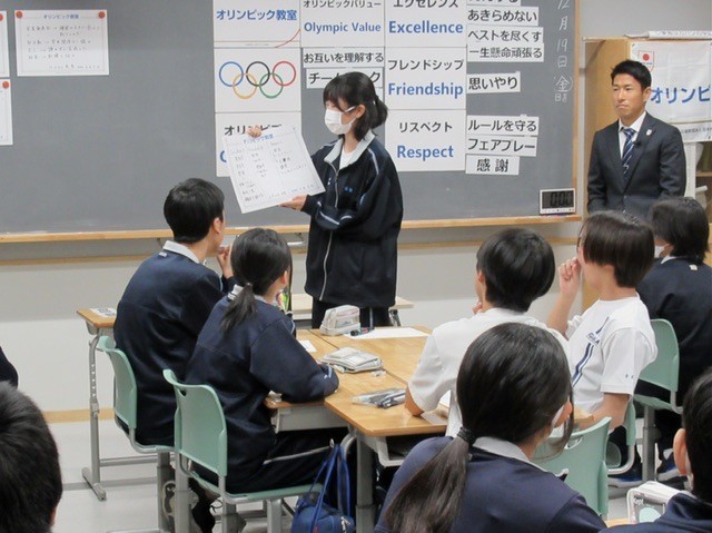 2年A組 『 オリンピック教室 』 の様子つづき、「 オリンピックバリュー 」について、ご自身の競技生活を通して、詳しくお話をいただきました。オリンピックの3つの Value ( バリュー = 価値 ) である・Excellence ( エクセレンス = 卓越 )・Friendship ( フレンドシップ = 友情 )・Respect ( リスペクト = 敬意 / 尊重 )について解説していただきました。その後、生徒たちは、 『 普段の生活の中で、「 オリンピックバリュー 」 に当てはまると思うことを考えよう。 』 をテーマに、グループで話し合い、クラス全員で共有しました。「エクセレント=卓越・ベストを尽くす・あきらめない・全力で取り組む」こと。「 フレンドシップ = 友情 ・ 思いやり ・ お互いを理解する ・ チームワーク 」 こと。「リスペクト」= 敬意 / 尊重 ・ フェアプレー ・ ルールを守る 」 こと。こうした 「 オリンピックバリュー 」 は、学校生活のあらゆる場面で生かされることと思います。写真 : 6~8枚目、 オリンピアンと共に記念撮影をし、 「 オリンピック教室 」 の授業を終えました。校長:高田勝喜