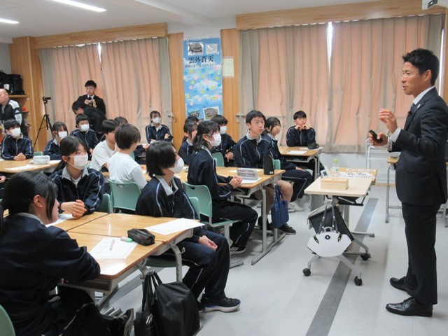 上山 容弘 先生は、数多くの国際大会で優勝、全日本選手権大会では7回の優勝、日本人選手初の世界ランキング1位に輝いた方です。現在も競技を続けながら、トランポリン教室のコーチを就てめていらっしゃいます。また、講演活動やトランポリン体験イベント等に積極的に参加し、後進の育成や競技の普及活動に取り組んでいるそうです。トランポリンの競技ルールやオリンピックでの競技種目になるまでのこと。また、「 演技点 ・ 難易度 ・ 跳躍点 ・ 移動点 」 と、トランポリンの採点基準など、多くのことを学びました。「 オリンピックに出場できる選手は、世界で16名 」とのこと。その狭き門を2度も通過したことのある方ですが、中学生の生徒たちに、わかりやすくご自身の競技人生をお話しいただきました。A組同様、 『 オリンピックバリュー 』について考えましたが、日常の活動や学校行事に生かされていることがたくさんあることに、生徒たちは気づいたことと思います。