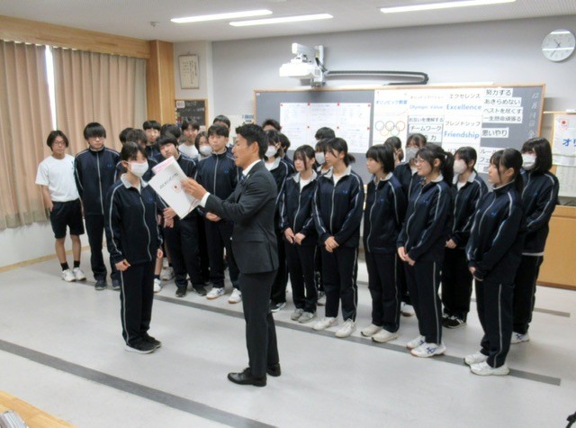 2年A組 2時間目 『 オリンピック教室 』 の様子つづき、『 オリンピック教室 』 の授業で、2年A組の講師を務めてくださったのは、 【 陸上競技 / 競歩 】 で 「 東京オリンピック 」 に出場された「 勝木 隼人 先生 」 です。勝木 隼人さんは、 「 世界陸上競技選手権大会2025 ( 3位 ) 」 をはじめ、国際大会等で活躍されています。また、 「 日本陸上競技選手権大会2025 」 で優勝されている現役のアスリートです。『 オリンピック教室 』 は、体育館での運動の授業と教室での座学の授業の2時間をオリンピアンが担当します。競技生活を通して学んだことや考えていること 「 オリンピックバリュー 」 について話していただきます。写真 : 3 ~ 5枚目は、お持ちいただいた 「 メダル 」 を生徒たちの手に。 本物の重さを体験させていただきました。校長:高田勝喜 -