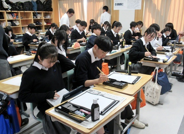 邦楽でしょうか? 音楽が流れる中、生徒たちの力作がたくさん並べられた教室内は、新年の幕開けにふさわしい、とても和やかな雰囲気でした。