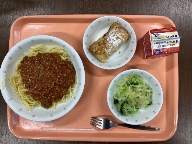 スパゲティミートソース・グリーンサラダ・キャラメルバナナパイ・牛乳