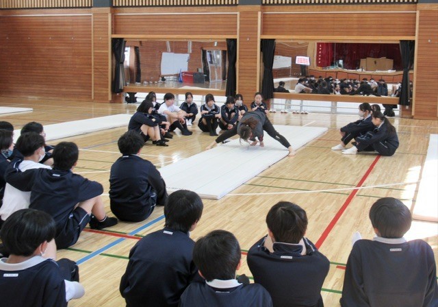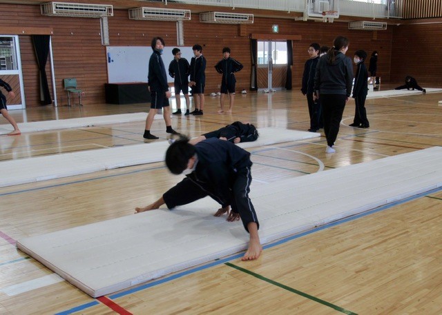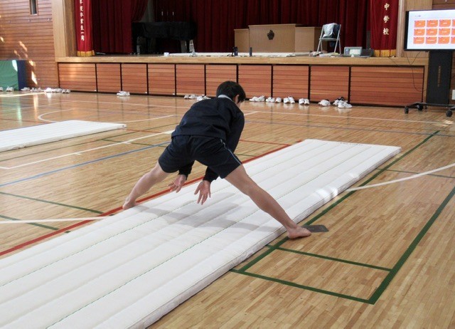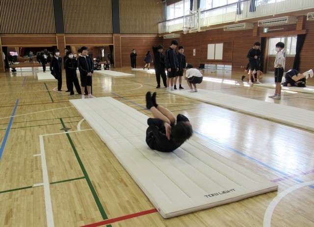 校舎内の廊下はかなり冷え込んでいます。しかし、体育館は空調で暖められているので快適です。前時から1年生は、 『 マット運動 』 に取り組んでいます。