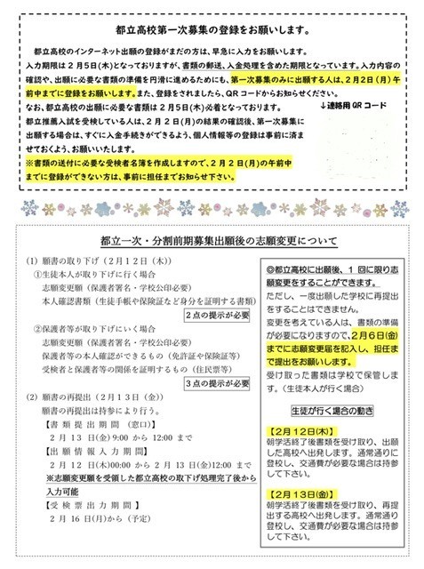都立高校第一次募集の出願登録の締切が迫っています。中学校からの書類は、2月5日必着となっています。