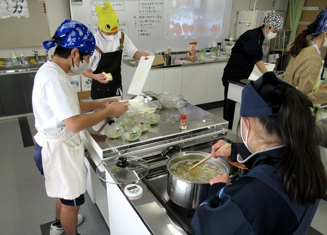 D組も 『 スパゲティミートソースとツナサラダ 』 の調理に挑戦しています。包丁の使い方の練習として、 『 きゅうりの薄切り 』 に取り組みましたが、みんな上手に 「 きゅうりの薄切り 」 ができていました。今回も 「 きゅうりの薄切り 」 のデモンストレーションを行い、日ごろの成果を披露、 みんなから温かい拍手をもらい、とてもうれしかったです。実習中は、役割分担をしっかり行い、手際よく作業を進めていました。写真 : 8枚目、美味しそうな 『 スパゲティミートソースとツナサラダ 』 が完成。「 今日は給食がないからちょうど良かったね。 」 に 「 食べるの楽しみ! 」 と、みんなの笑顔があふれる素敵な時間となりました。2時間続きの 「 調理実習 」 ですが、準備 から 調理、 試食、 片付けまでを100分間でこなすのは、大変だと思いますが、みんなで協力し、最後までしっかりと取り組んでいました。校長:高田勝喜