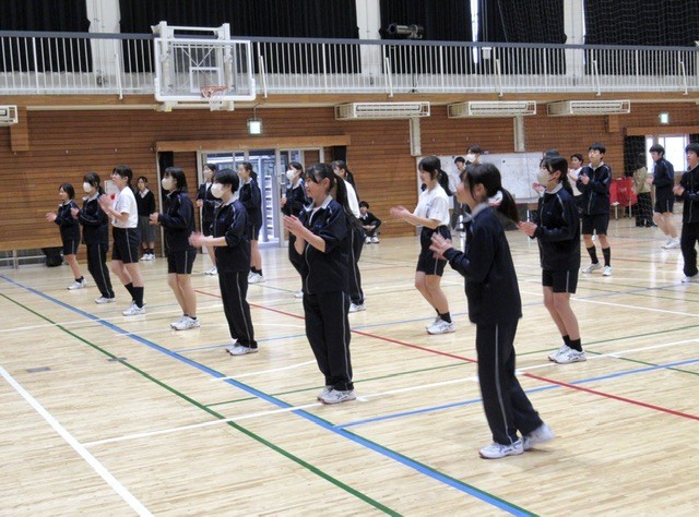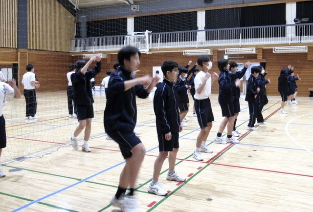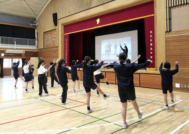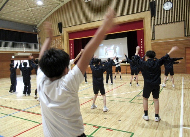 1年生は、スクリーンに映し出された練習用の映像を見ながら、動きの確認をしていました。