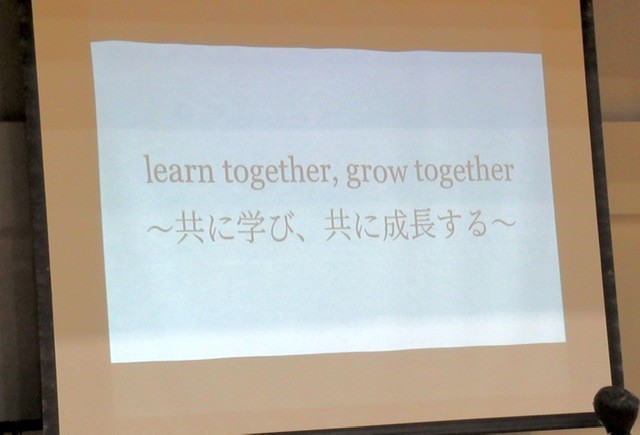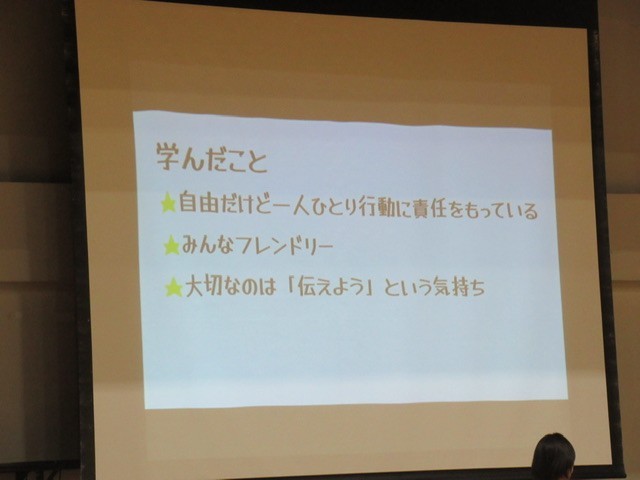 後ろの扉からそっと会場に入ると、写真 : 1枚目、 発表している代表生徒が、ちょっと気まずそうな笑いに。その瞬間、会場は大きな笑いに!