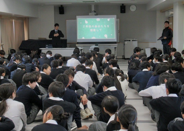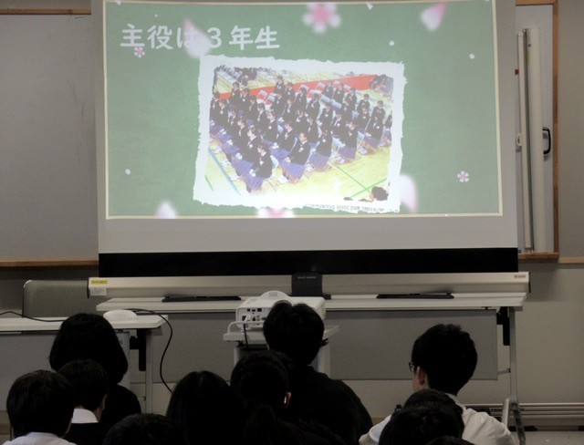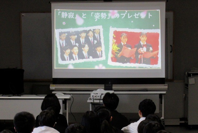 スライドを使いながら、生徒たちに問いを立てながら、2週間後の卒業式に1年生としてどのように参加するのかを、共に考えていました。