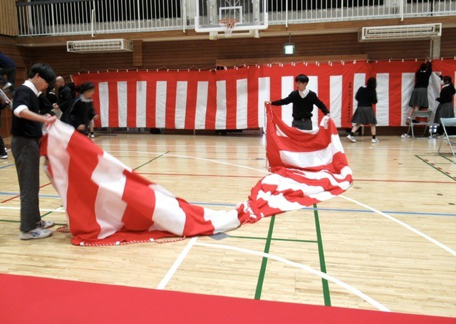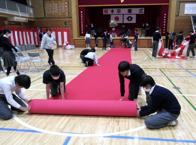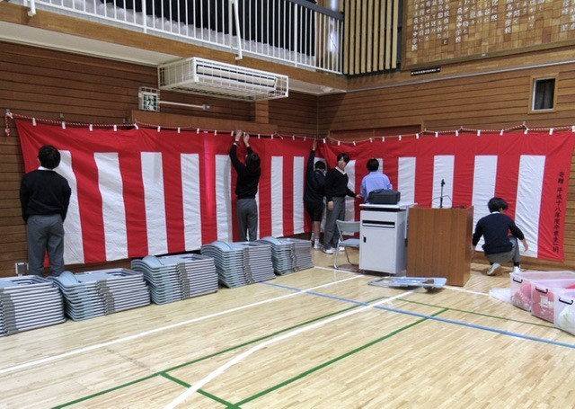 1・2年生による 「 卒業式 」 会場設営の様子です。