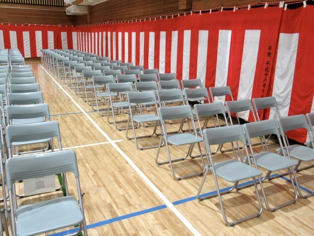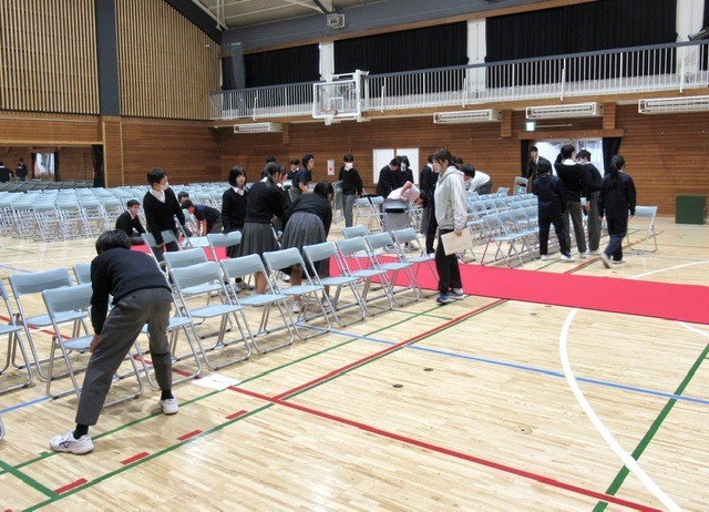 1・2年生、教職員が力を合わせ、 「 令和7年度 第77回 卒業式 」の会場が整いました。