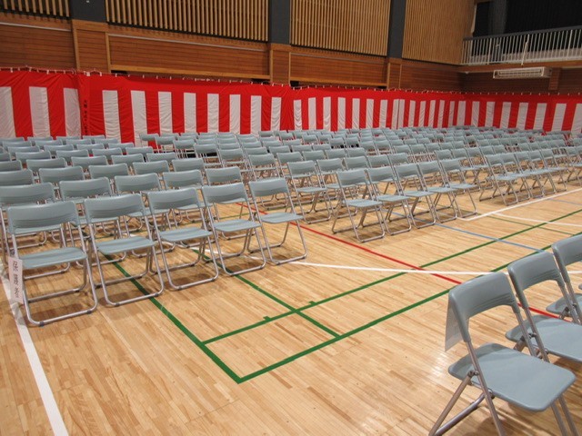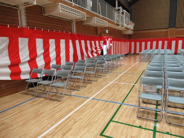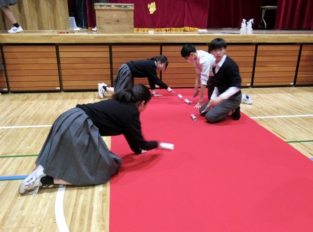 壇上を整える生徒 ・ 紅白幕をはる生徒 ・ レッドカーペットを設える生徒 ・ 生徒席、来賓席、保護者席とパイプ椅子を並べる生徒 ・ ・ ・ と、役割を分担し、手際よく会場準備を進めてくれました。