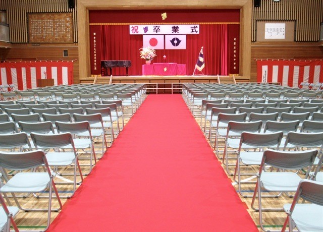3年前にレッドカーペットを導入、一昨年から「 式歌 」 を舞台側から披露することにしました。