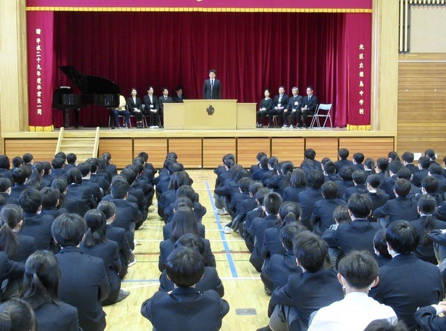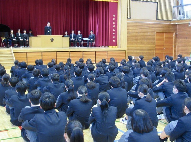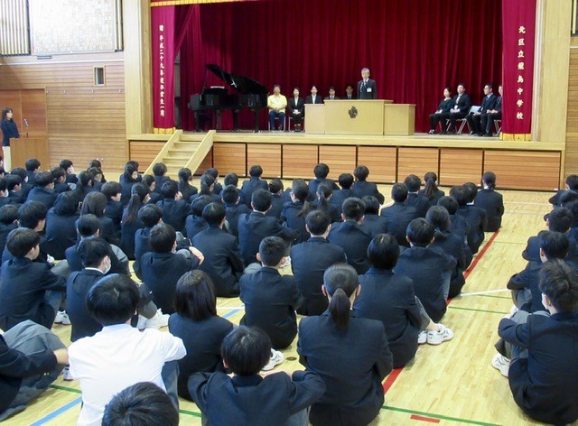 涙ながらに別れの言葉を述べられる先生、先日の卒業式への感謝を伝える先生、これからの飛鳥中に期待することを伝える先生と、生徒たちは、それぞれの先生方のお話を真剣に聞いていました。
