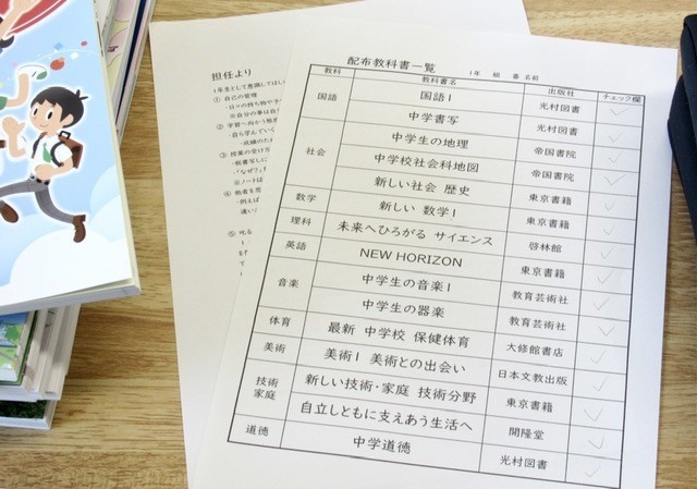 写真:4枚目、教科書と一緒に 「 教科書一覧表 」 が配られ、過不足 ・ 落丁等がないか、1冊1冊確認していました。