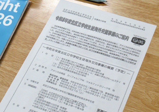 写真:2枚目のとおり、 「 令和8年度北区立学校生徒海外交流事業のご案内 」 を配布しました。