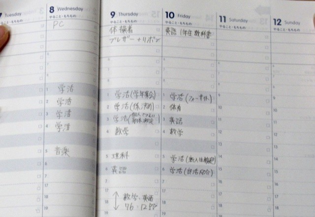 すでに、写真4枚目のとおり、予定等が書きこまれ、ページ下部には、その日の振り返りも記入されています ( 個人情報なので、トリミングしています ) 。