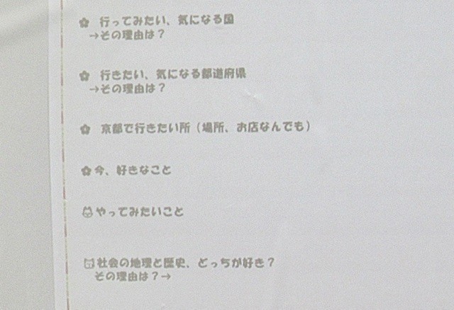 写真 : 3枚目、 「 自己紹介カード 」 には、 「 行ってみたい、気になる国 」 や 「 行きたい、気になる都道府県 」 などの欄があり 、 「 その理由 」 も記入します。