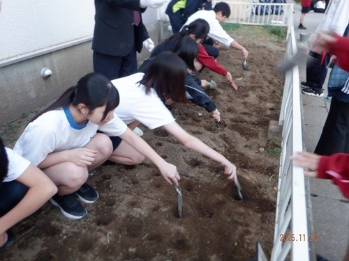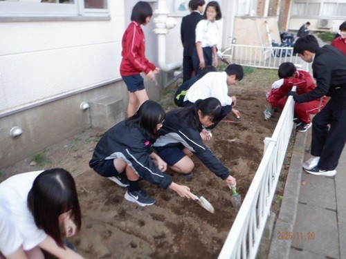 ボランティアが集まり、三年教室の下に咲く春を待ちます。