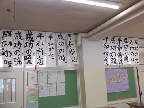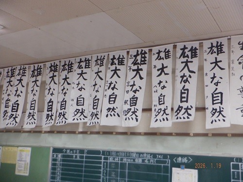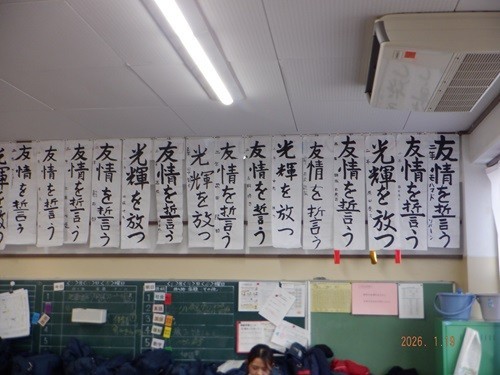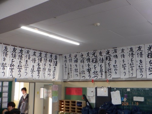 校内では冬休みの課題であった書初めがクラス内に展示されています。