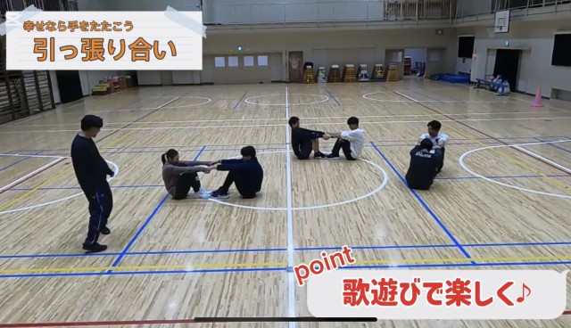体のバランスをとる運動遊び 「くるっとじゃんけん」→「しあわせなら手をたたこう」