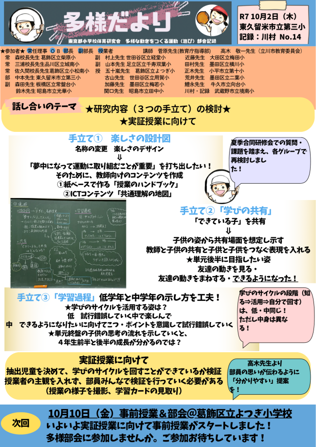 「多様な動きをつくる運動(遊び)について一緒に勉強したい!」「興味があるから部会に参加したい!」「小体研に入りたい!」という方は、ぜひ部会に1度参加ください。お待ちしています!