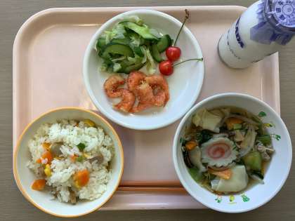 毎月19日は「食育の日」です。「食育の日」の給食には、出来るだけ地元のものを用いて、そのことを紹介しようと考えています。先月の「食育の日」にも出しましたが、今日は新潟市で水揚げされた「南蛮えび」のから揚げが主菜です。また、この時期にしか登場しない「さくらんぼ」は聖籠町産です。他にも三色ごはんに入っている、にんじんと玉ねぎ、ワンタンスープに入っている小松菜、塩もみに使われたきゅうりは新潟市産です。キャベツは新潟県産です。このように、地元の美味しい食べ物を使って給食を作っています。