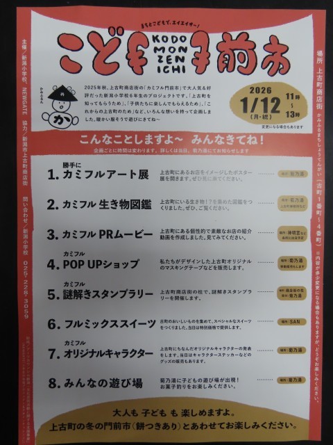 11月に開催された「こどもんぜんいち」に引き続き、冬のカミフル門前市にあわせて『こどもんぜんいち』が1月12日(月)11時~13時に開催されます。今回も6年生が総合的な学習の時間で取り組んできた学びの成果を展示や発表、販売等を通して地域の皆さんにお届けします。ぜひ、多くの皆さんから足を運んでいただけるとうれしいです。