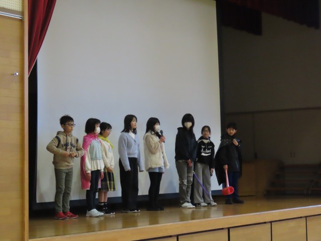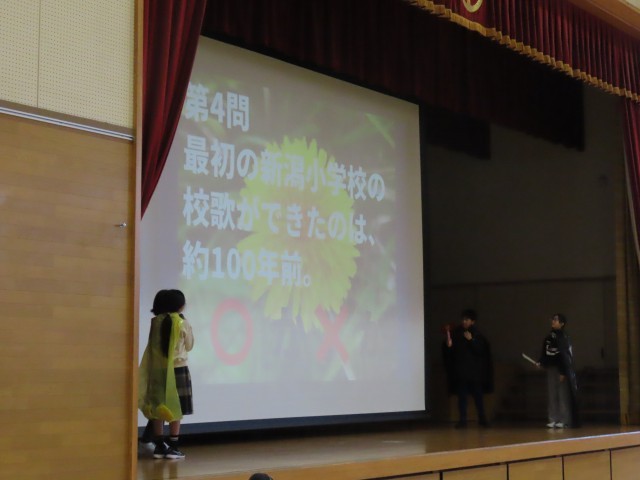 2月のたんぽぽ朝会は、文化・歴史プロジェクトの皆さんによる劇と校歌クイズを行いました。校歌はいろいろな思いが込められて作られている、また現在の校歌は30年以上前から歌われているなど、これからも大切に歌い継いでいこうという思いを全校のみんなに伝えていました。
