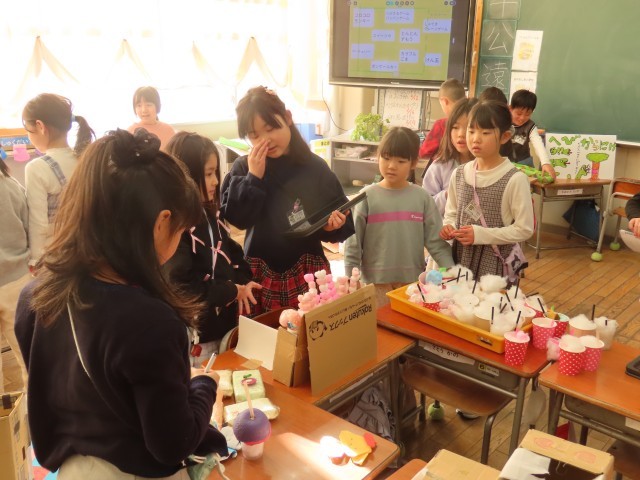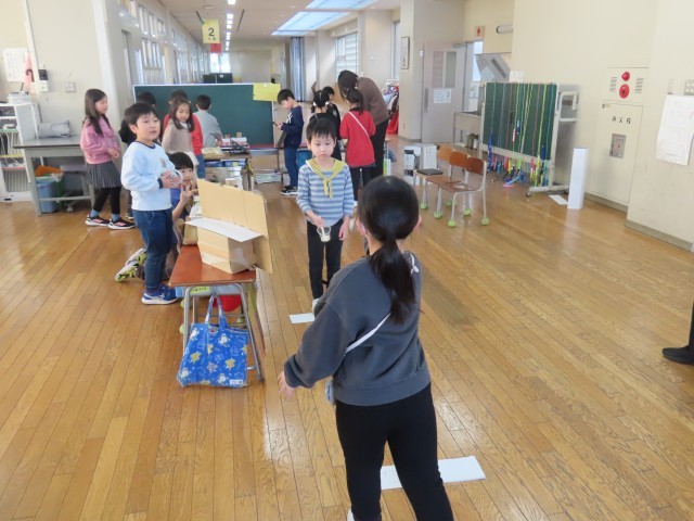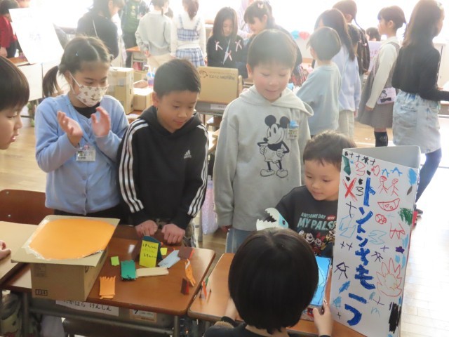 2年生は生活科の学習で「おもちゃまつり」を開催しました。お客さんの1年生に楽しんでもらおうと大きな声で呼び込みをしたり、優しくゲームの説明をしたりしていました。みんなが笑顔で楽しそうに活動していました。