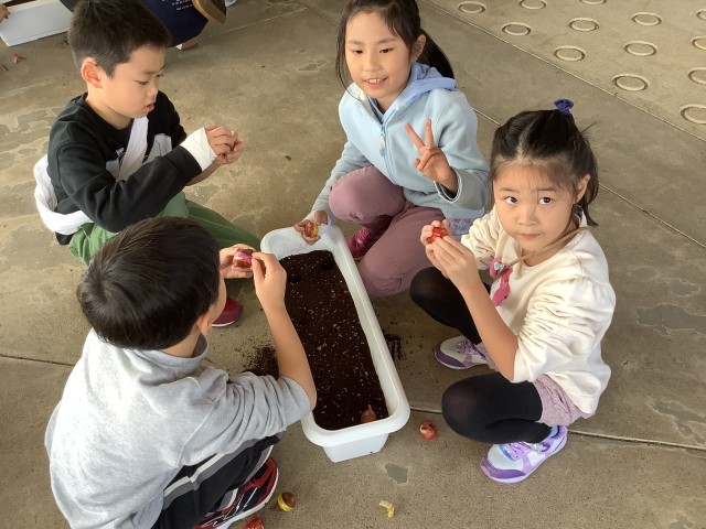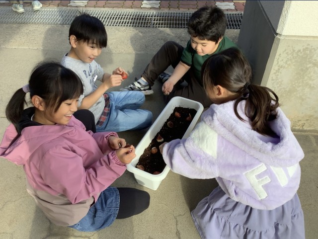 人権教育の一環として、プランターにチューリップの球根を植えました。