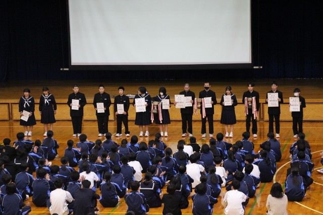 本日、授賞集会を行いました。県青少年美術展、吹奏楽コンクール、科学展覧会、地区新人大会、県駅伝競走大会、各種スポーツ大会や応募作品などで活躍した100名を超える生徒の活躍を称えました。また、U15JS...