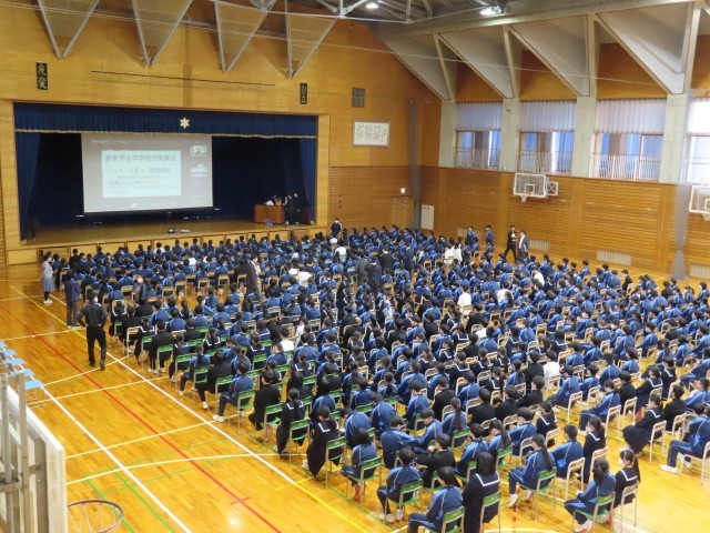 射水市の6中学校生徒会合同集会が行われました。本校では体育館に全校生徒が集まり、各中学校のSNSの適切な利用に関する取組の紹介を聞きました。