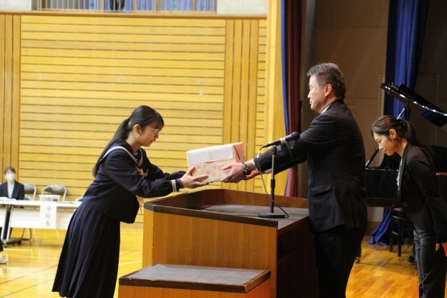卒業生に対して、生徒会・PTA・射水市教育委員会より記念品が贈られました。