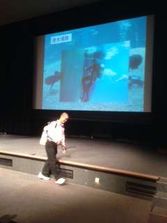 たくさんのお客さんの中から小杉中学校の生徒が選ばれて、ボンベを背負う体験をしました!飼育係の仕事は重労働だなぁ