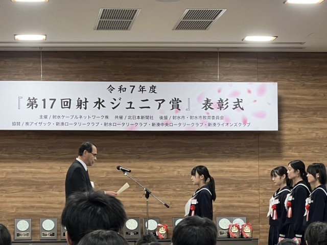 2025年に活躍した小中高生を表彰する「第17回射水ジュニア賞」の表彰式がクロスベイ新湊で開かれました。本校からは、昨年3月に第48回全日本アンサンブルコンテスト(全国大会)で金賞を受賞した、吹奏楽部...