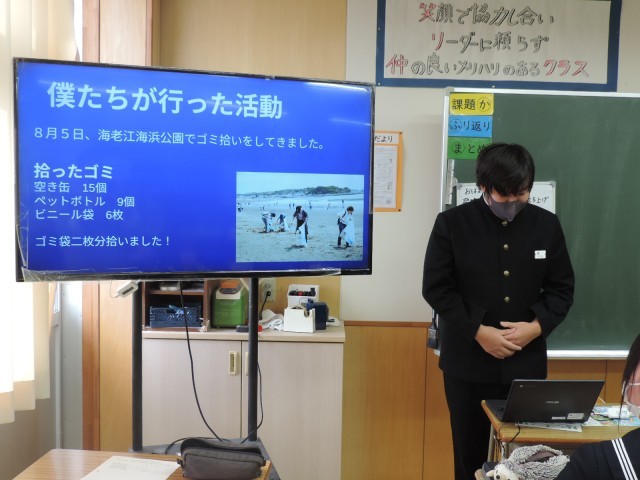 11月5日(水)6限に「よりよい社会をつくるために、SDGsの視点から私たちができること」についての発表会がありました。今年6月から取り組んできた集大成をそれぞれの班が一つの作品としてまとめ、クラス全体で発表しました。