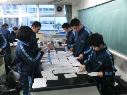生徒会では、18日(月)に行われる校内年賀状抽選会に向け、最後の仕分け作業を行いました。生徒会執行部の生徒や各クラスの代議員が理科室に集合し、一人一人丁寧に個人への仕分け作業を行いました。
